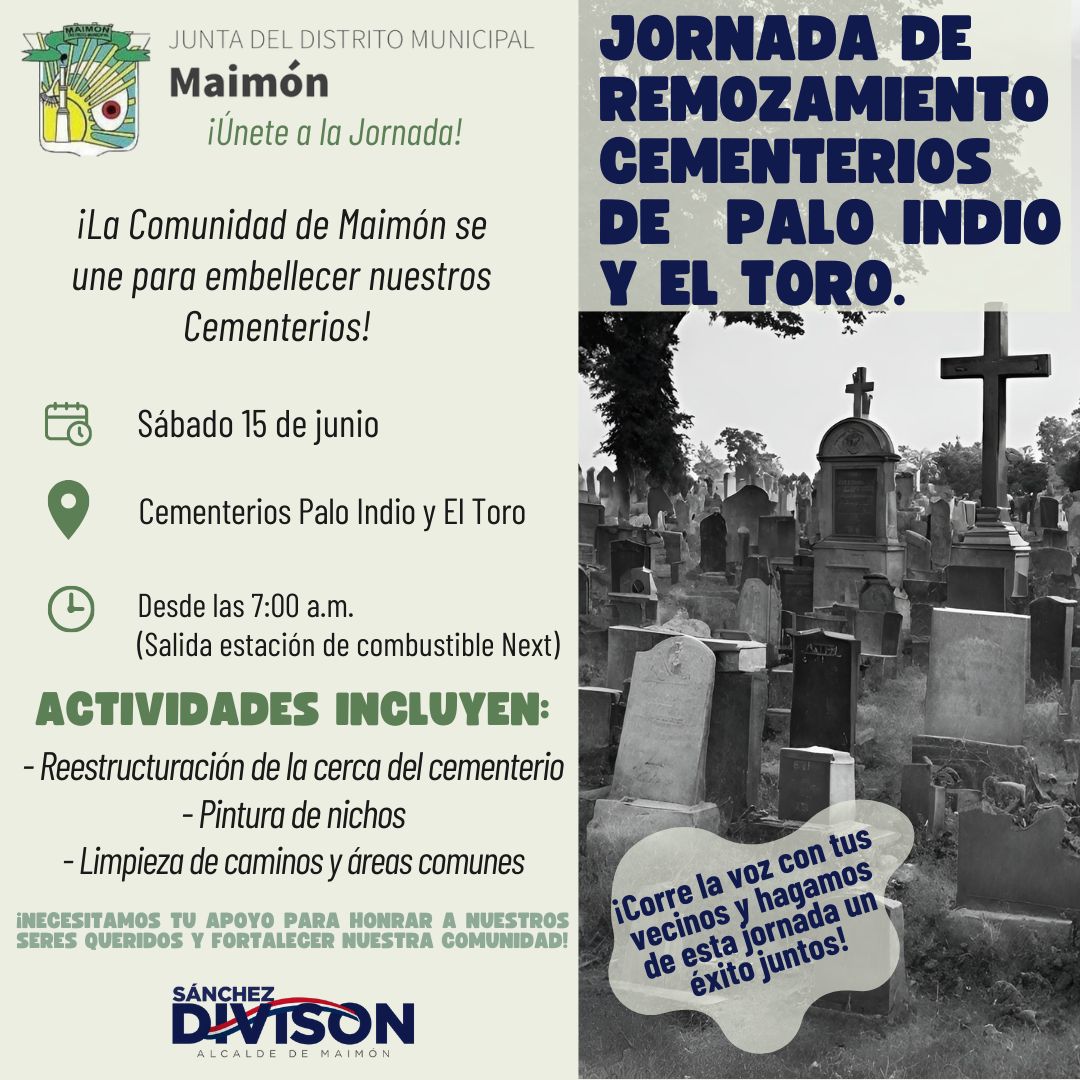 Maimón- Únete a la iniciativa de la nueva gestión de la junta distrital de Maimón para remozar los cementerios del distrito. Continuaremos este sábado 15 de junio a las 7:00 am, saliendo desde la estación de combustible Next, para irnos a los cementerios de Palo Indio y El Toro. ¡Ven y limpia la tumba de tus seres queridos con el apoyo de la alcaldía, que proporcionará pintura y suministros necesarios!