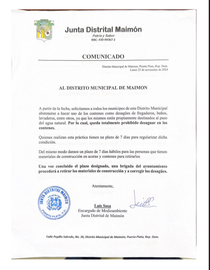 Maimón, Puerto Plata- A partir de la fecha, solicitamos a todos los munícipes de este Distrito Municipal abstenerse a hacer uso de los contenes como desagües de fregaderos, baños, lavaderos, entre otros, ya que los mismos están propiamente destinados al paso del agua natural. Por lo cual, queda totalmente prohibido desaguar en los contenes.