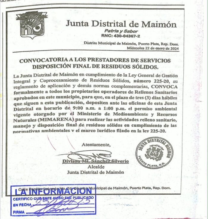 Maimón, Puerto Plata. La Junta Distrital de Maimón en cumplimiento de la Ley General de Gestión Integral y Coprocesamiento de Residuos Sólidos, número 225-20, su reglamento de aplicación y demás normas complementarias, CONVOCA formalmente a todos los propietarios operadores de Rellenos Sanitarios aprobados en este municipio, para que, en el plazo de tres (3) días hábiles que siguen a esta publicación, depositen ante las oficinas de esta Junta Distrital en horario de 9:00 a.m. a 1:00 p.m. el permiso ambiental vigente otorgado por el Ministerio de Medioambiente y Recursos Naturales (MIMARENA) para realizar las actividades relleno sanitario, manejo y disposición final de residuos sólidos en cumplimiento de las normativas ambientales v el marco iurídico fiado en la ley 225-20.