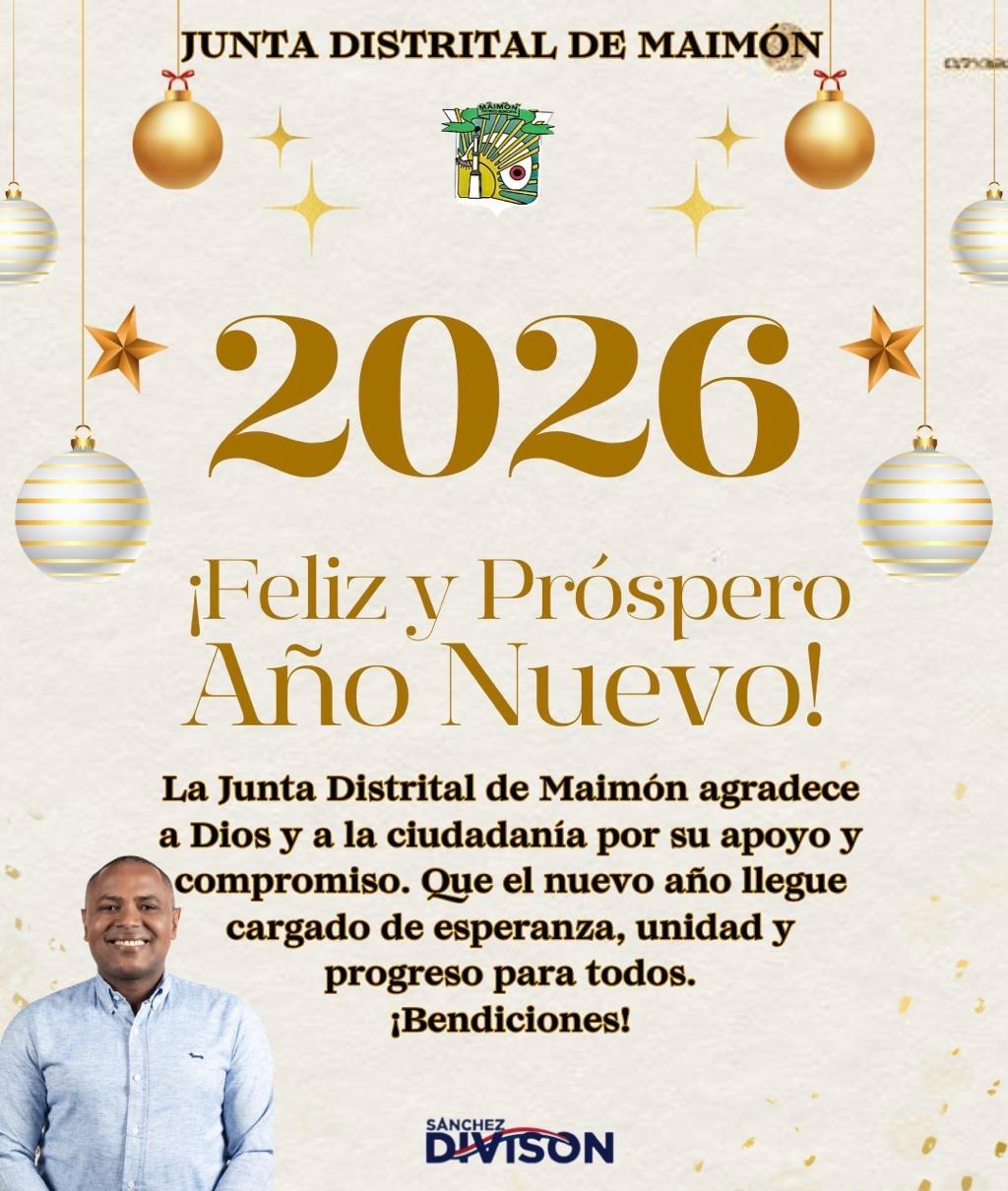 Maimon, Puerto Plata. La Junta Distrital de Maimón agradece a Dios y a la ciudadanía por su apoyo y compromiso. Que el nuevo año llegue cargado de esperanza, unidad y progreso para todos. Feliz y próspero año nuevo 2026.