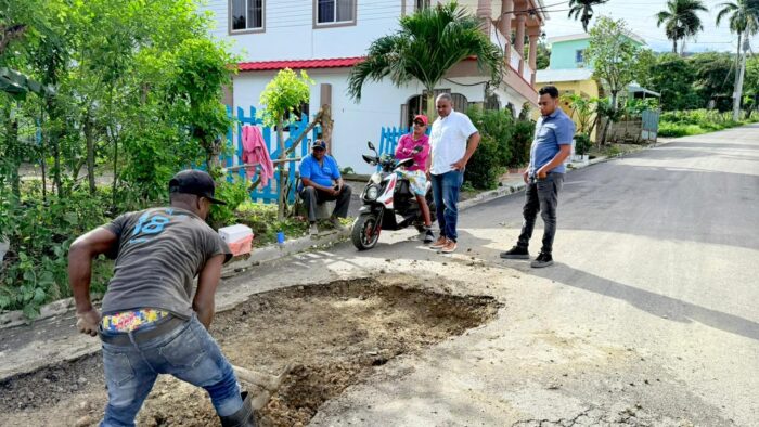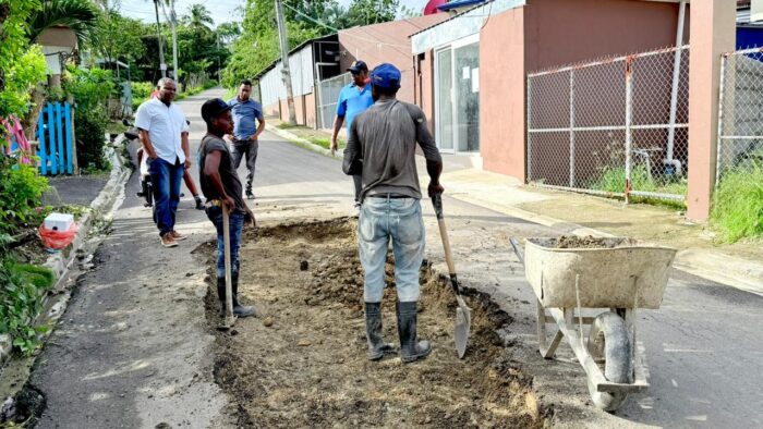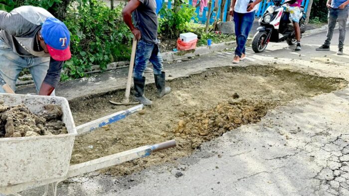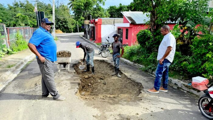 Maimón, Puerto Plata. – El alcalde de la Junta Distrital de Maimón, Divison Manuel Sánchez Silverio, dejó iniciados los trabajos de reparación y mantenimiento de la calle principal del sector Los Tejadas, mediante labores de bacheo y colocación de cemento, en beneficio de los residentes de la comunidad.