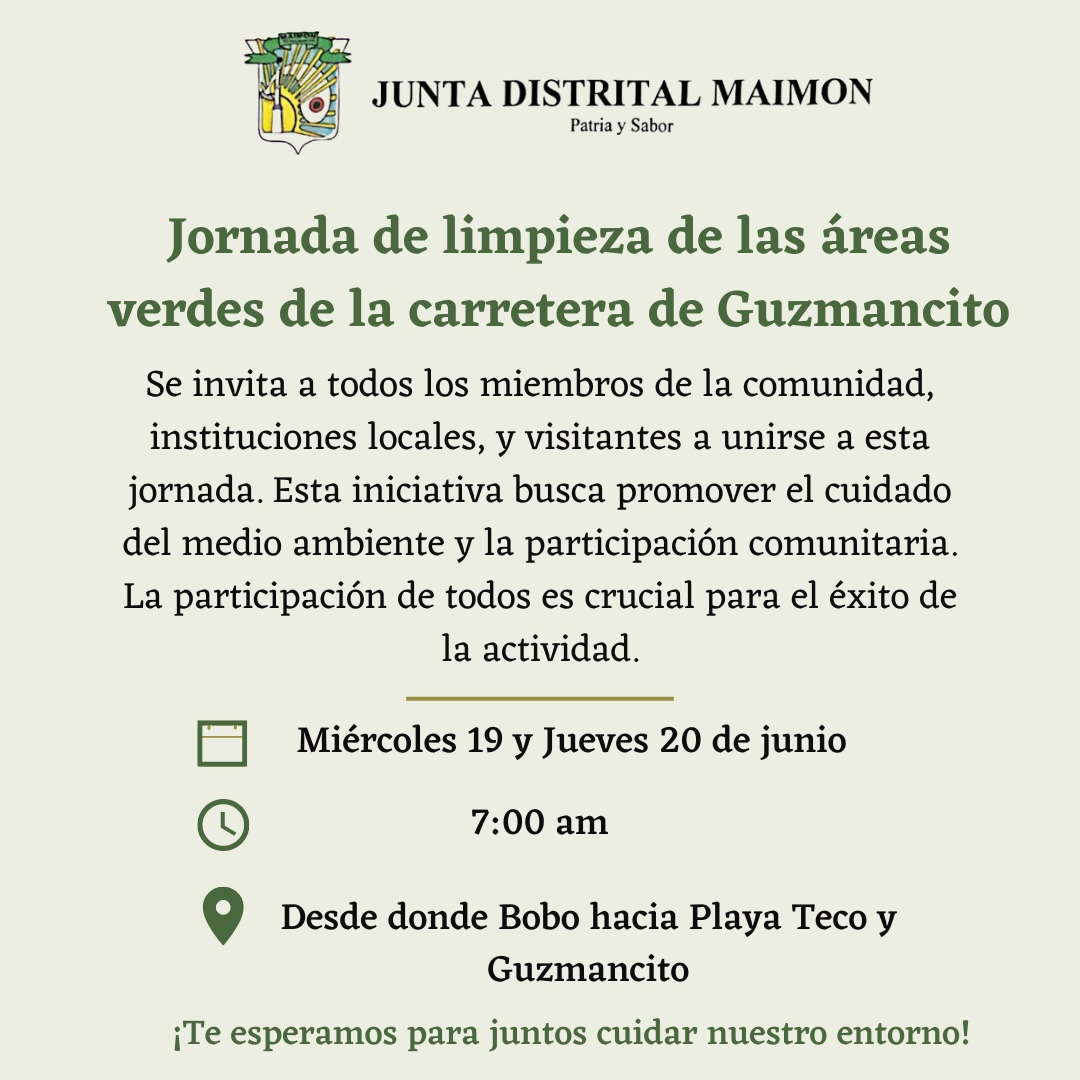 La Junta Distrital de Maimón invita a toda la comunidad a participar en nuestra *Jornada de Limpieza de las Áreas Verdes de la Carretera de Guzmancito*. Únete a nosotros para embellecer y conservar nuestras áreas naturales.